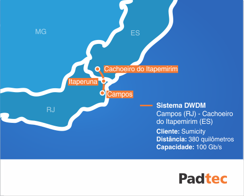 Para iluminar o novo anel óptico da provedora, a Padtec forneceu transponders, amplificadores ópticos e modernos sistemas duais de proteção de rota. No total, são 380 quilômetros de redes ópticas, com terminações nos municípios de Campos (RJ), Itaperuna (RJ) e Cachoeiro do Itapemirim (ES). Além dessa nova rota, a Sumicity iluminou recentemente outro anel óptico, entre os municípios de Campos e Itaperuna, no Rio de Janeiro, garantindo milhares de novas conexões de alta capacidade no estado.