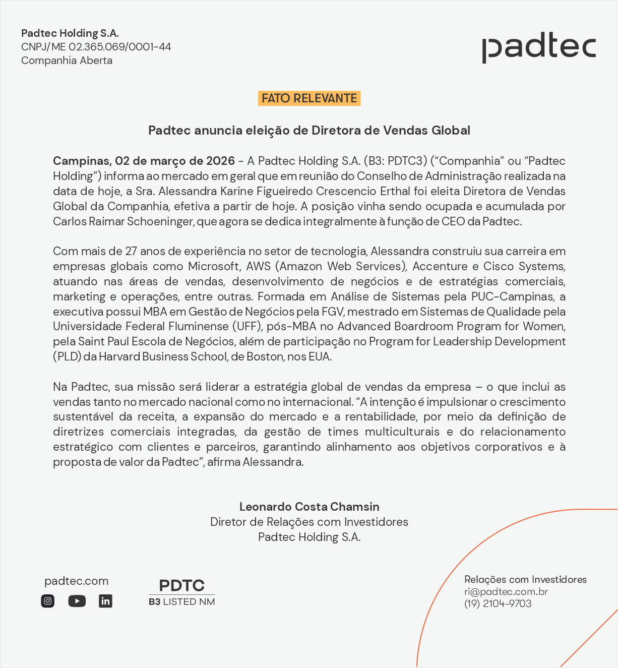Comunicado ao Mercado – Padtec anuncia alterações em sua Diretoria |
